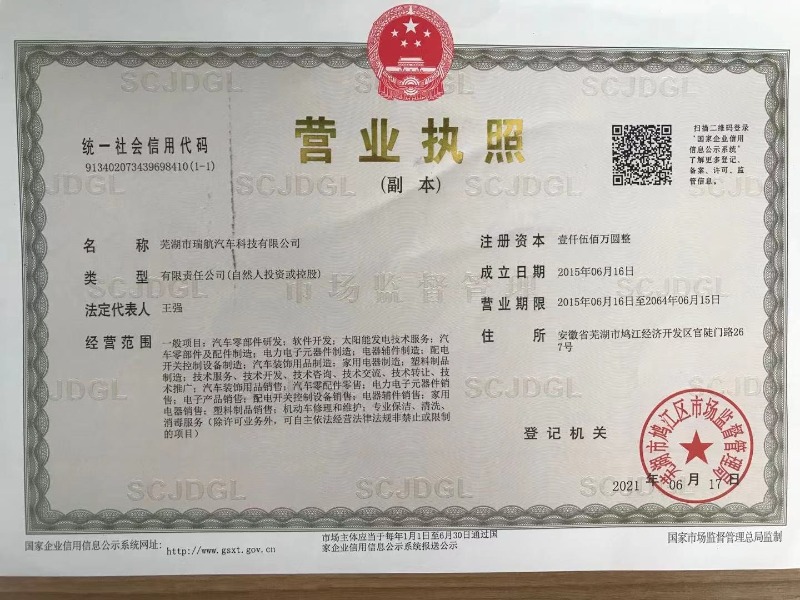蕪湖市瑞航汽車科技有限公司于2004年申請了汽車窗簾專利(專利號:ZL 2004 2 0062016.7 ZL 2004 2 0080718.8........)等幾十項專利,是一家專業從事汽車零部件的設計開發及生產和銷售的現代化科技型企業。主要生產遮陽簾、遮物簾、衣帽架、備胎蓋板、隔物板等系列產品。已通過IATF16949:2016體系認證及中國國家強制性產品認證證書(CCC)。 公司擁有自己的實驗室進行產品試驗驗證。有疲勞測試儀、氙燈耐候測試儀、載重測試儀、UL94水平垂直燃燒測試儀、汽車內...